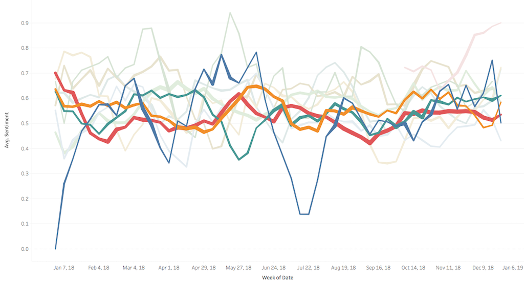 Analyze sentiment trends over time and identify emerging trends in key themes.